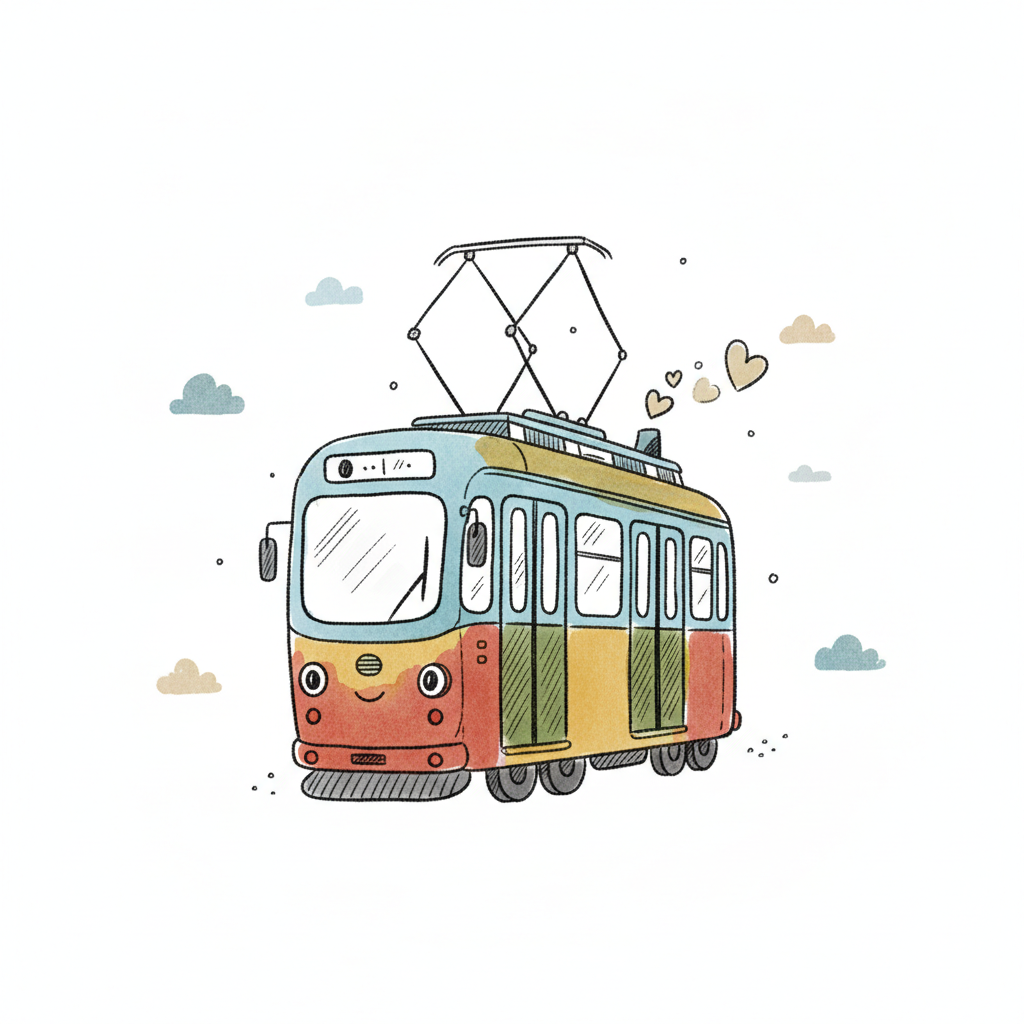Bunter Straßenbahnwagen mit Herzchen und Wolken im Hintergrund.