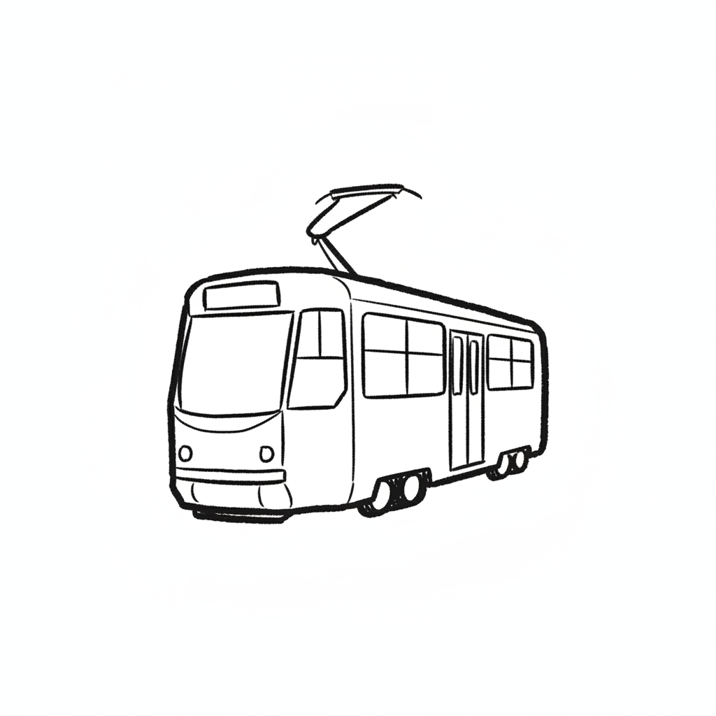 Skizze einer Straßenbahn mit Oberleitung und Türen.