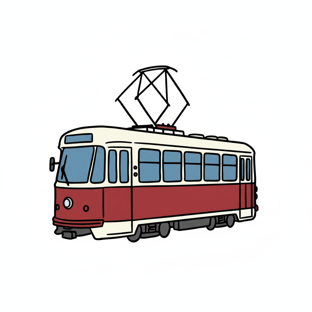 Ein stilisierter roter Straßenbahnwagen mit klaren Linien.