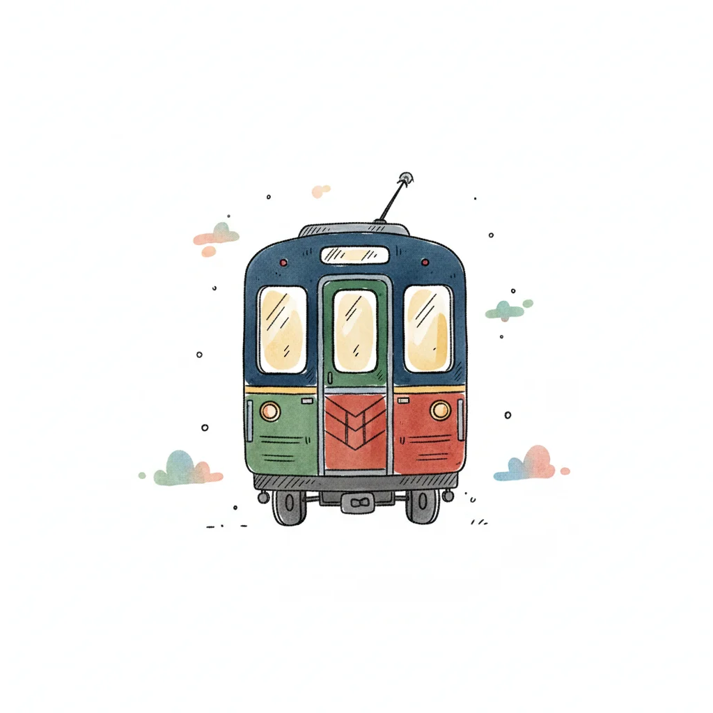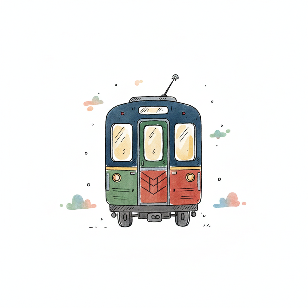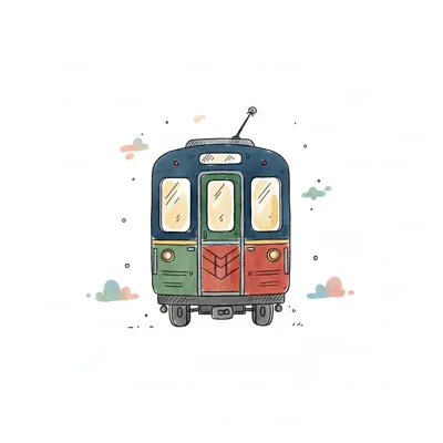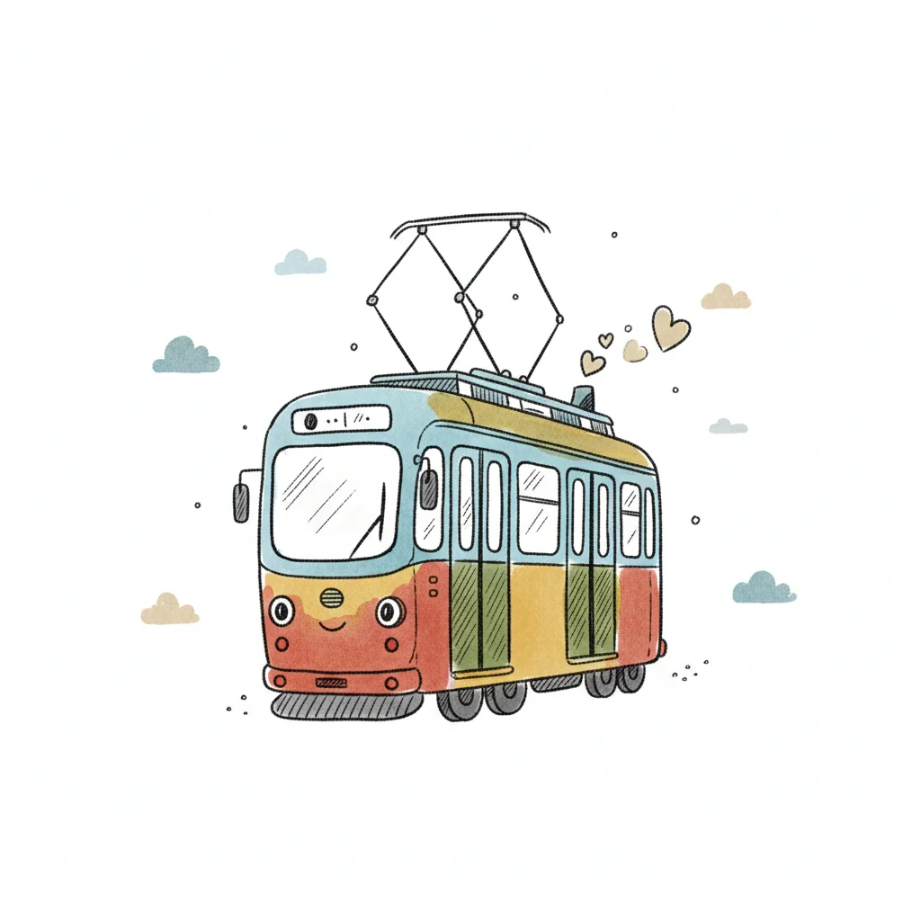 Bunt illustrierte Straßenbahn von hinten mit Wolken im Hintergrund.