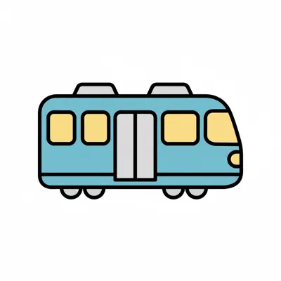 Ein stilisierter blauer Zug mit großen Fenstern und zwei Türen.