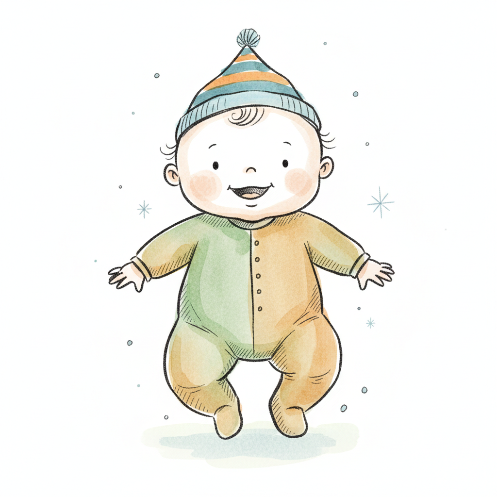 Niedliche Cartoon-Zeichnung eines lächelnden Babys in hellblauem Strampler auf weißem Hintergrund.