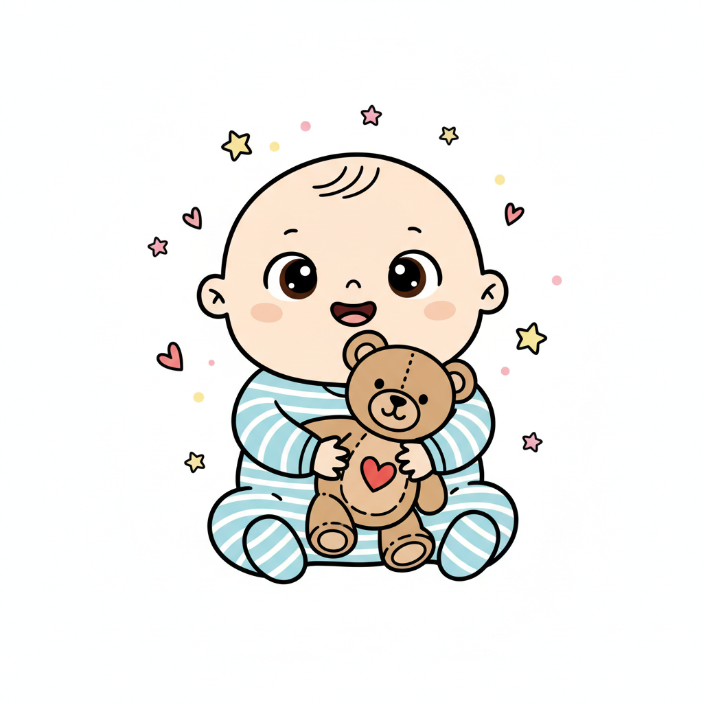 Niedliches Cartoon-Baby in blau-weißem Strampler hält einen Teddybär mit Herz, umgeben von Sternen.