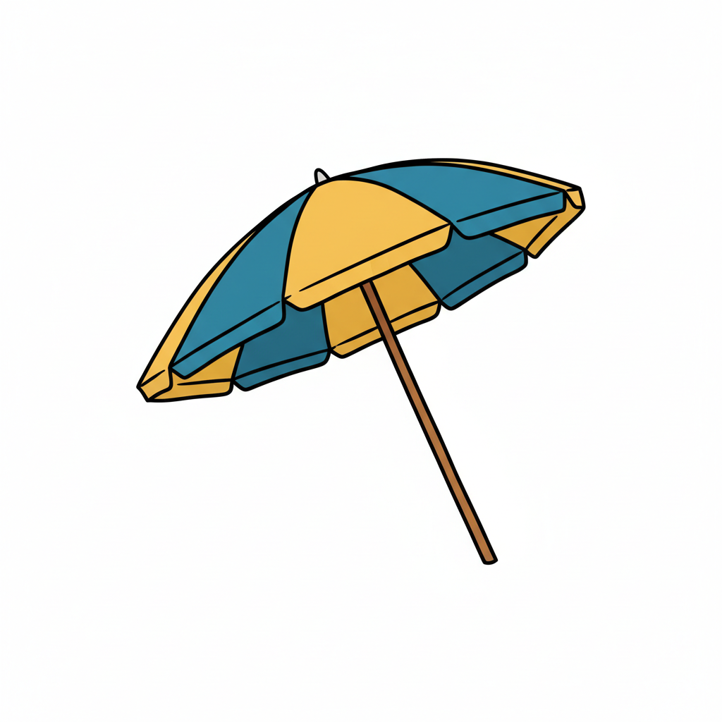 Eine gestreifte Strandsonnenschirm-Illustration in Blau und Gelb auf weißem Hintergrund.
