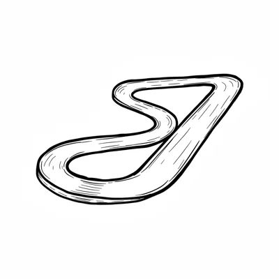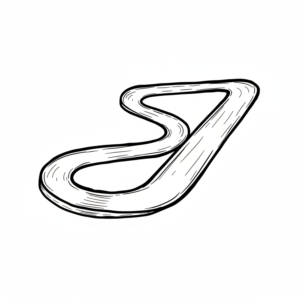 Schwarz-weiße Illustration einer kurvigen Rennstrecke oder Straße aus der Vogelperspektive.