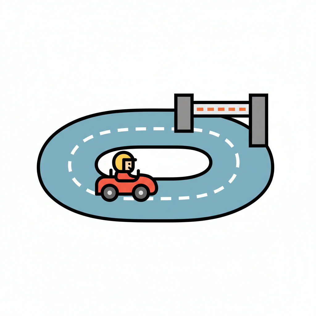 Cartoon eines Rennwagens mit Fahrer auf einer ovalen Rennstrecke mit Ziellinie.
