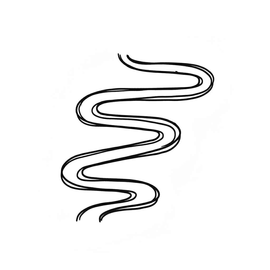Schwarz-weiße Illustration eines geschwungenen, doppelten Pfades oder Flusses auf weißem Hintergrund.