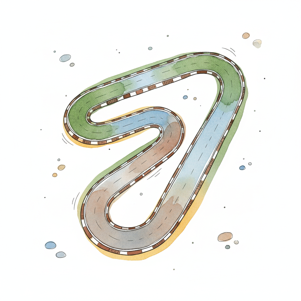 Aquarell-Illustration einer kurvigen Rennstrecke mit farbigen Abschnitten und karierten Randsteinen.