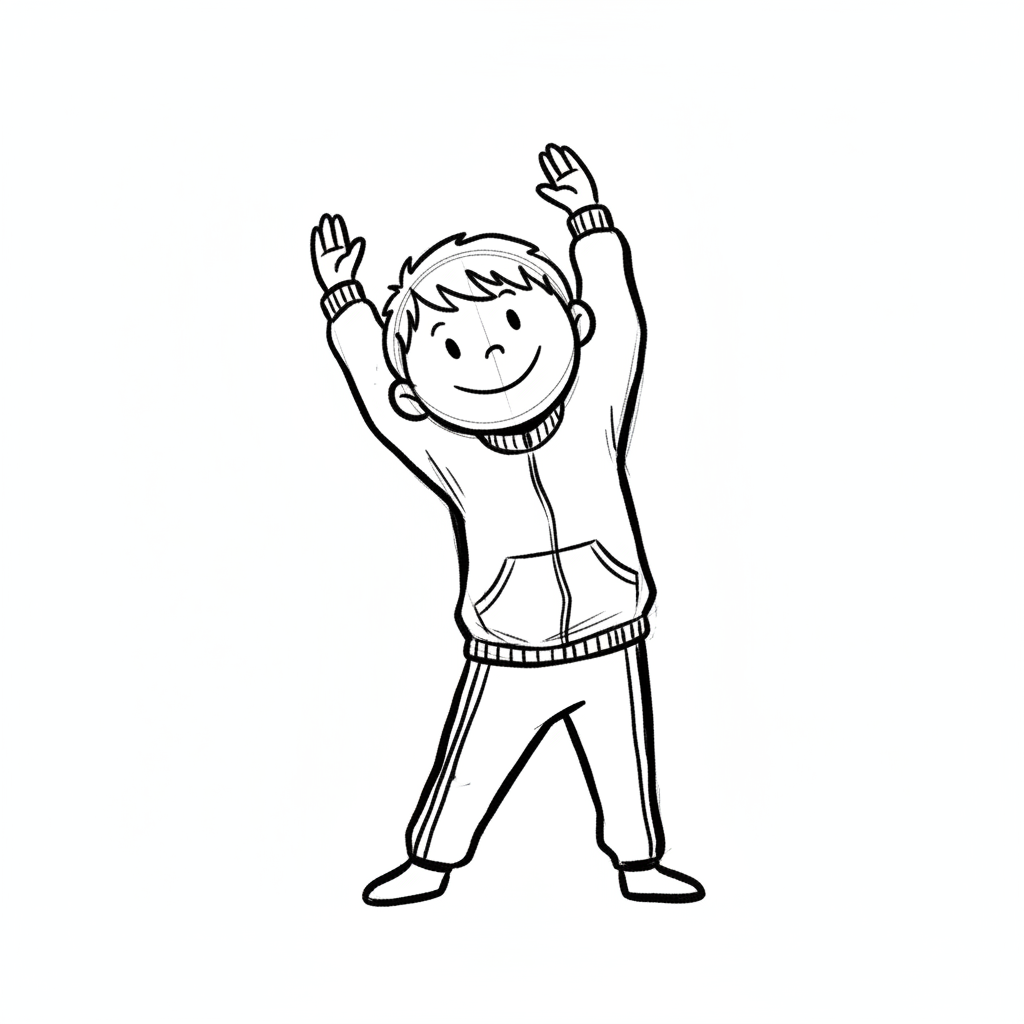 Schwarz-weiß-Zeichnung eines lächelnden Kindes in Sportkleidung, das sich streckt.