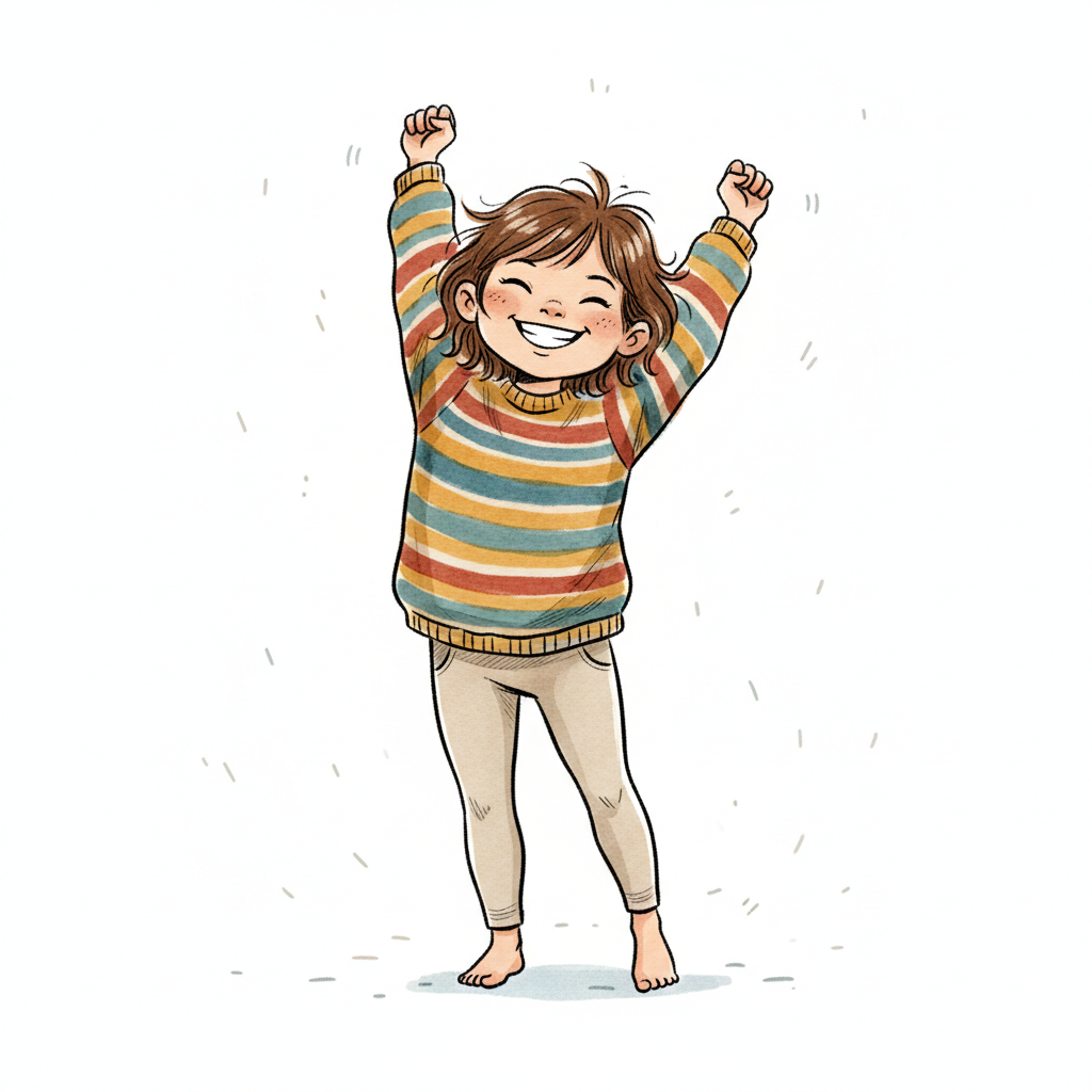 Niedliche, kindgerecht illustrierte Szene mit einem Kind oder einer Person als Hauptfigur, vor rein weißem Hintergrund, im frech-nordischen Aquarell-Skizzenstil. Klare, leicht wackelige Tuschekonturen, sichtbare Pinsel- und Strichtextur, dezente Schraffuren, weiche handgemalte Farbflächen in gedeckten Farben. Einfache, runde Formen. Keine harten Schatten, sondern sanfte, transparente Aquarellschichten. Leicht raue, handgezeichnete Linien statt glatter Vektorkanten. Subtile, vereinzelte Kritzelpunkte oder kleine Details im Hintergrund (wie Pünktchen oder feine Striche), aber keine echte Umgebung oder Landschaft. Die Figur ist mittig zentriert. Insgesamt charmant, humorvoll, warm und handgemacht wirkend. WICHTIG: Das Bild darf ABSOLUT KEINEN TEXT, KEINE BUCHSTABEN und KEINE ZAHLEN enthalten.