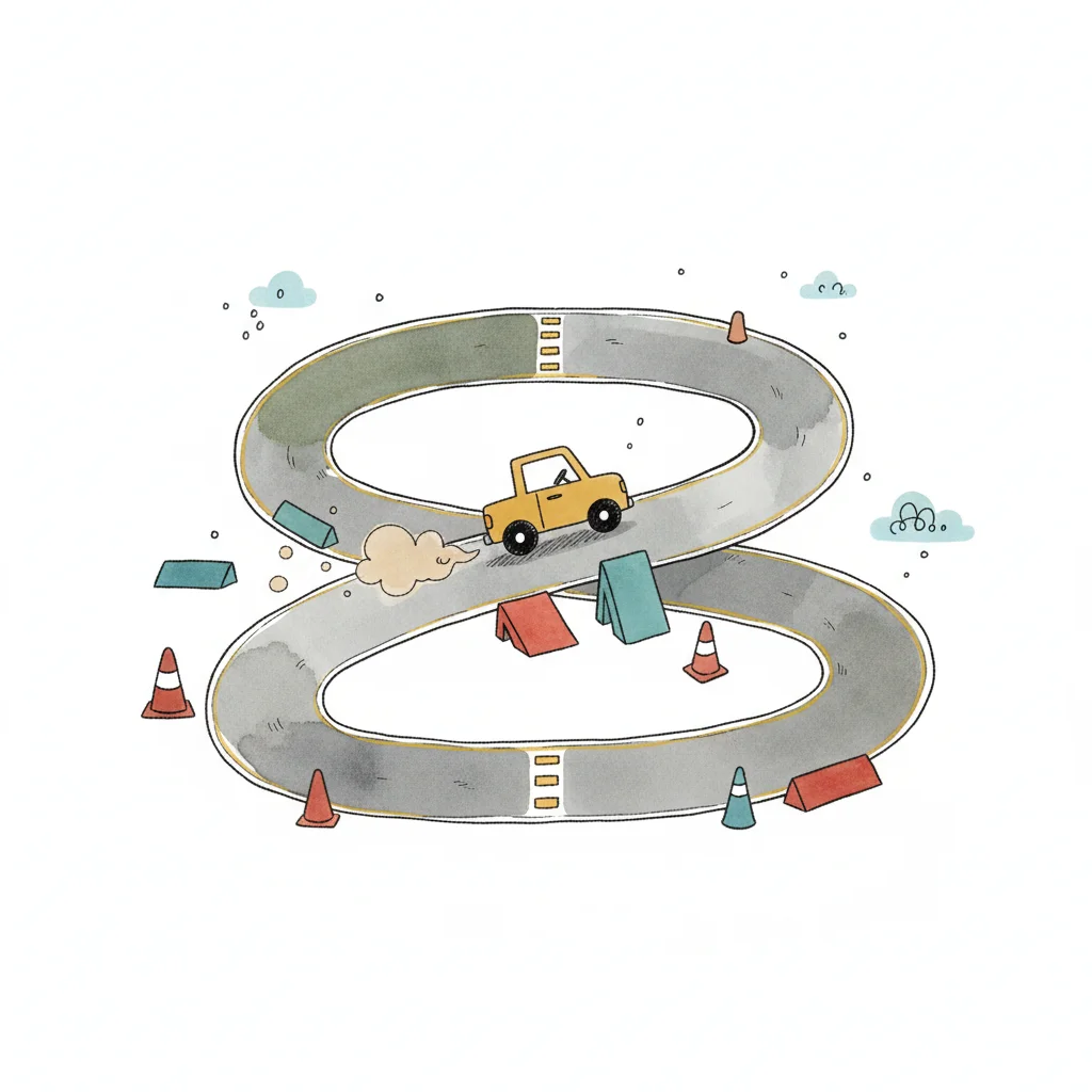 Illustrierte Rennstrecke in Form einer Acht mit kleinen Autos, Pylonen und grünen Rändern.