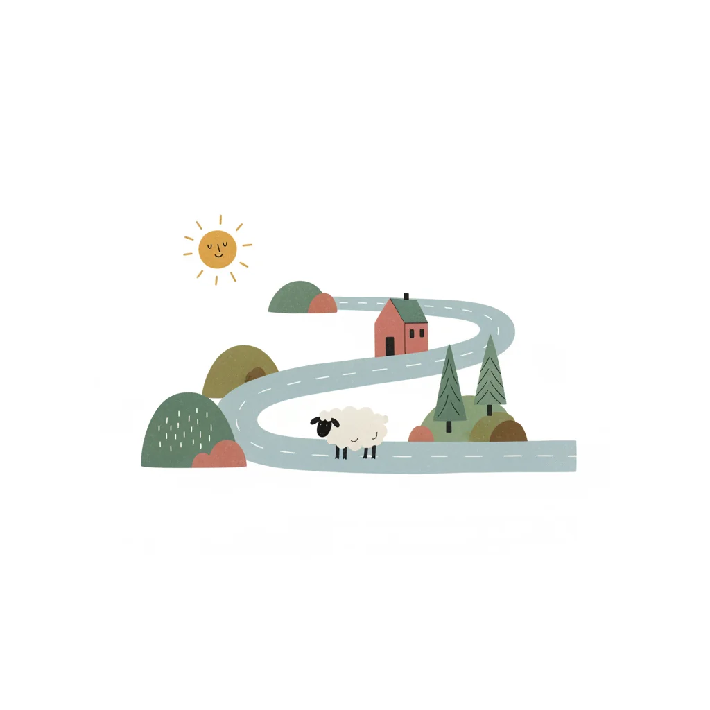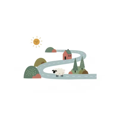 Niedliche Illustration einer kurvigen Straße mit Haus, Schaf, Hügeln und lächelnder Sonne.