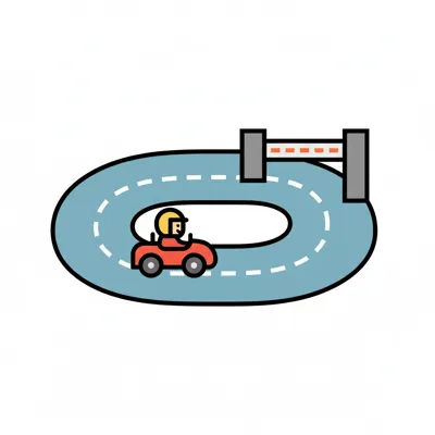 Illustrierte Rennstrecke mit kleinem Auto, Fahrer, Pylonen und Zielflagge, umgeben von einer Kette.