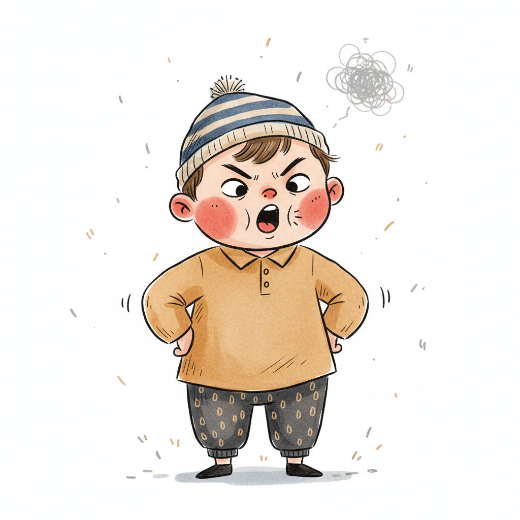 Wütender Junge mit Mütze und einen unzufriedenen Gesichtsausdruck.