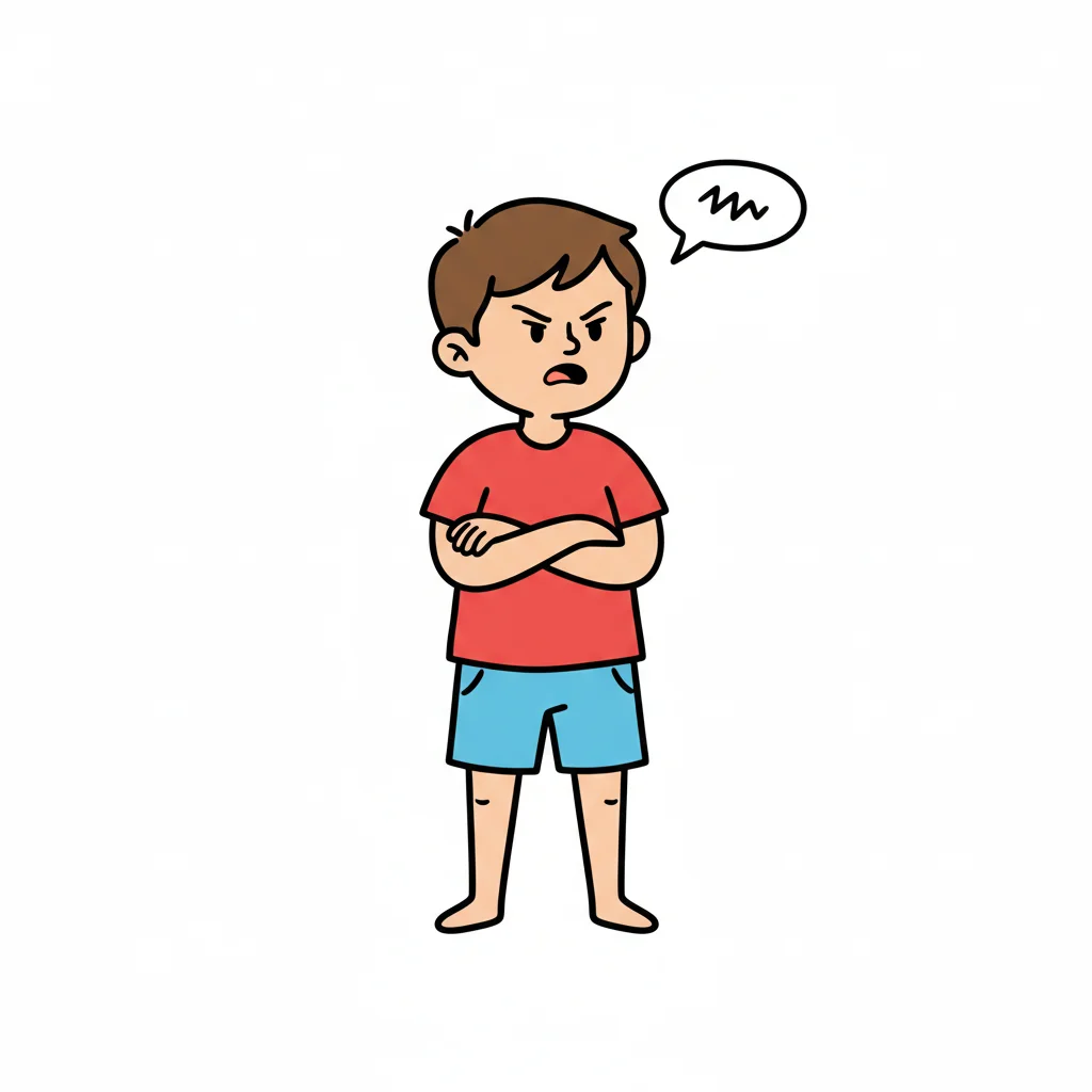 Ein Junge mit verschränkten Armen sieht wütend aus.