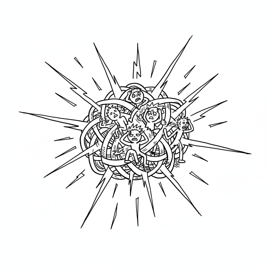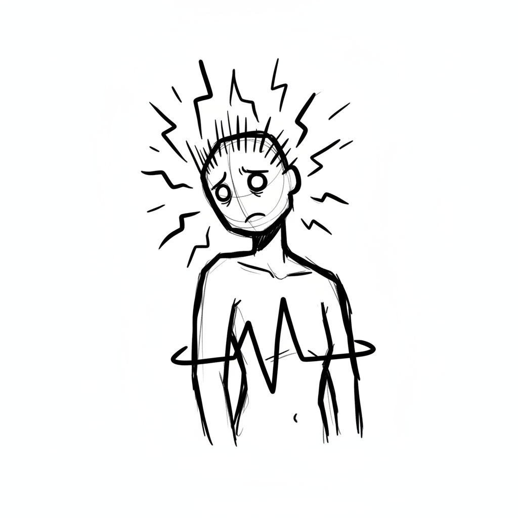 Ängstliche Figur mit Schmerzen, von Linien umgeben, zeigt emotionalen Stress.
