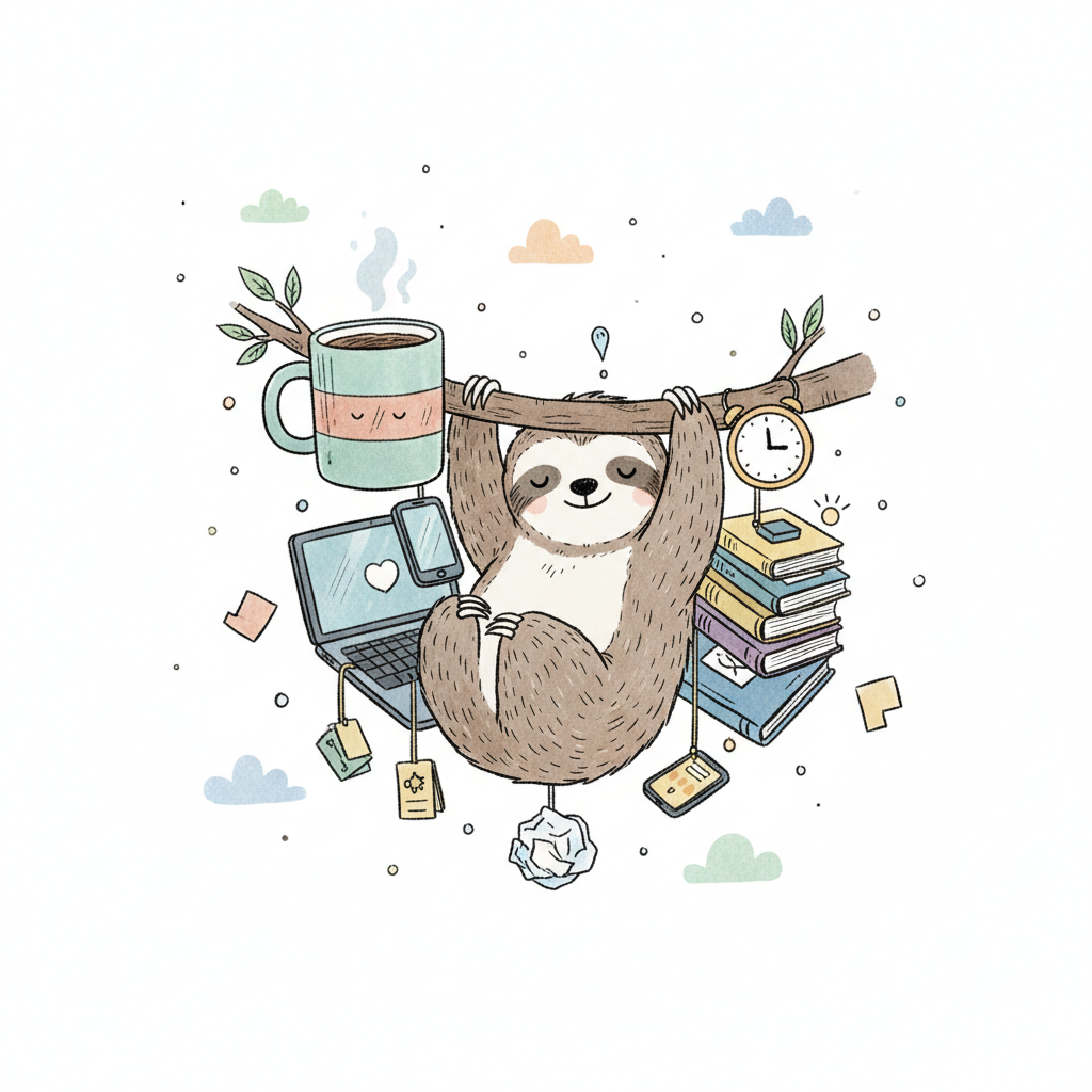 Ein lustiger Faultier, das an einem Ast hängt, umgeben von Büchern, Laptop und Kaffee.