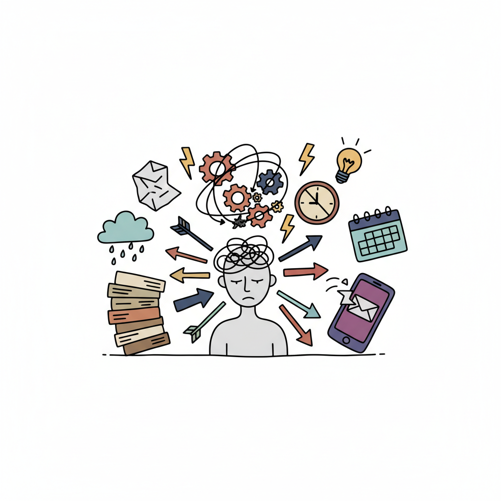 Eine Person mit Gedankenchaos symbolisiert Stress und Überforderung.