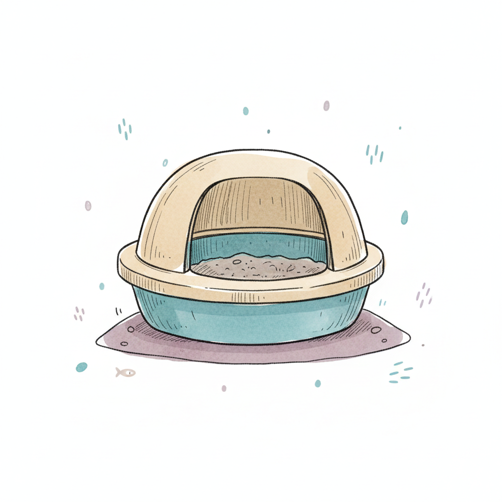 Handgezeichnete Katzentoilette mit Haube und Streu auf einer Matte in Pastellfarben.