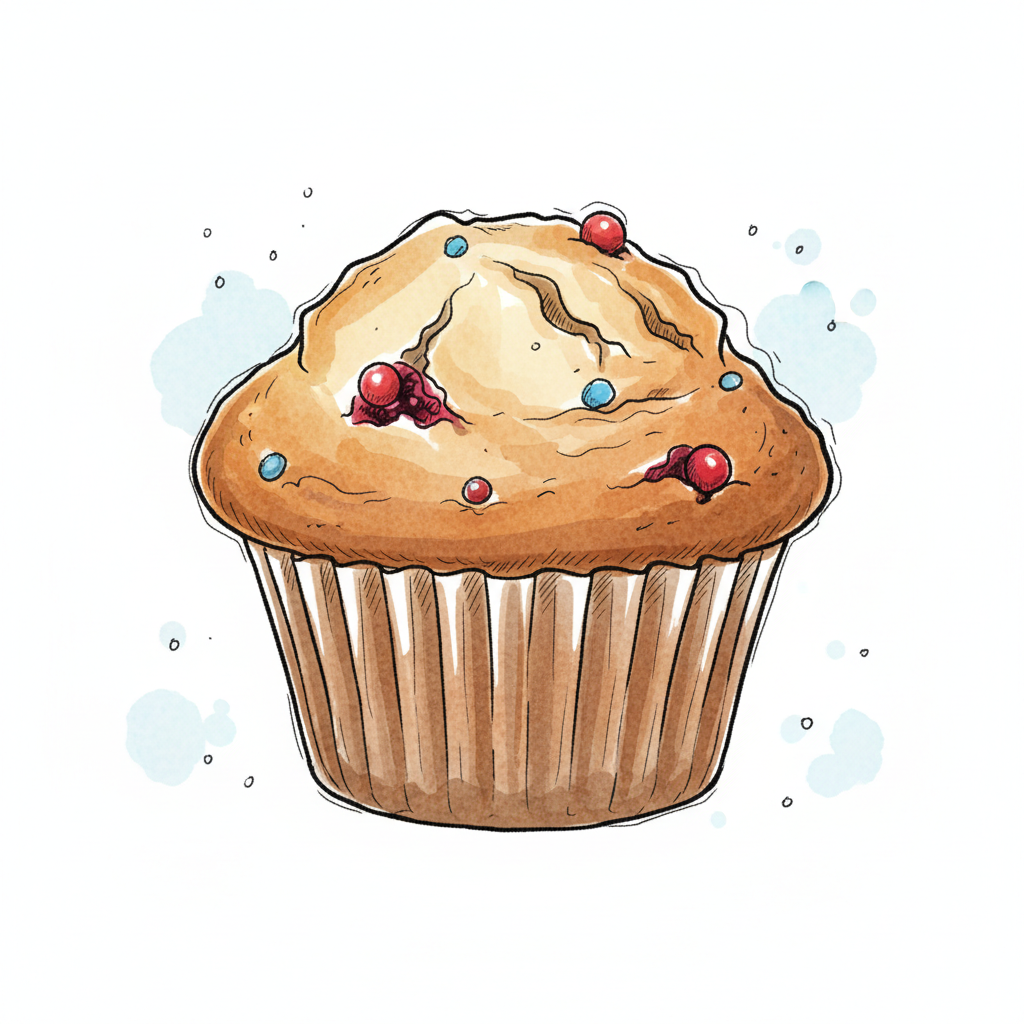 Illustrierter Muffin mit roten und blauen Streuseln in einem Papierförmchen, leichter Aquarell-Hintergrund.