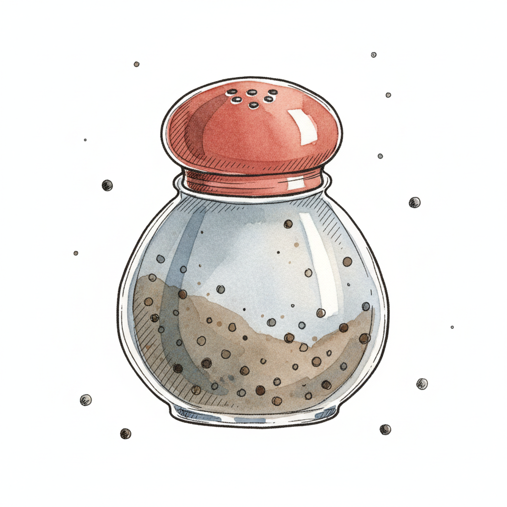 Aquarell-Illustration eines Pfefferstreuers mit schwarzem Pfeffer und rotem Deckel.