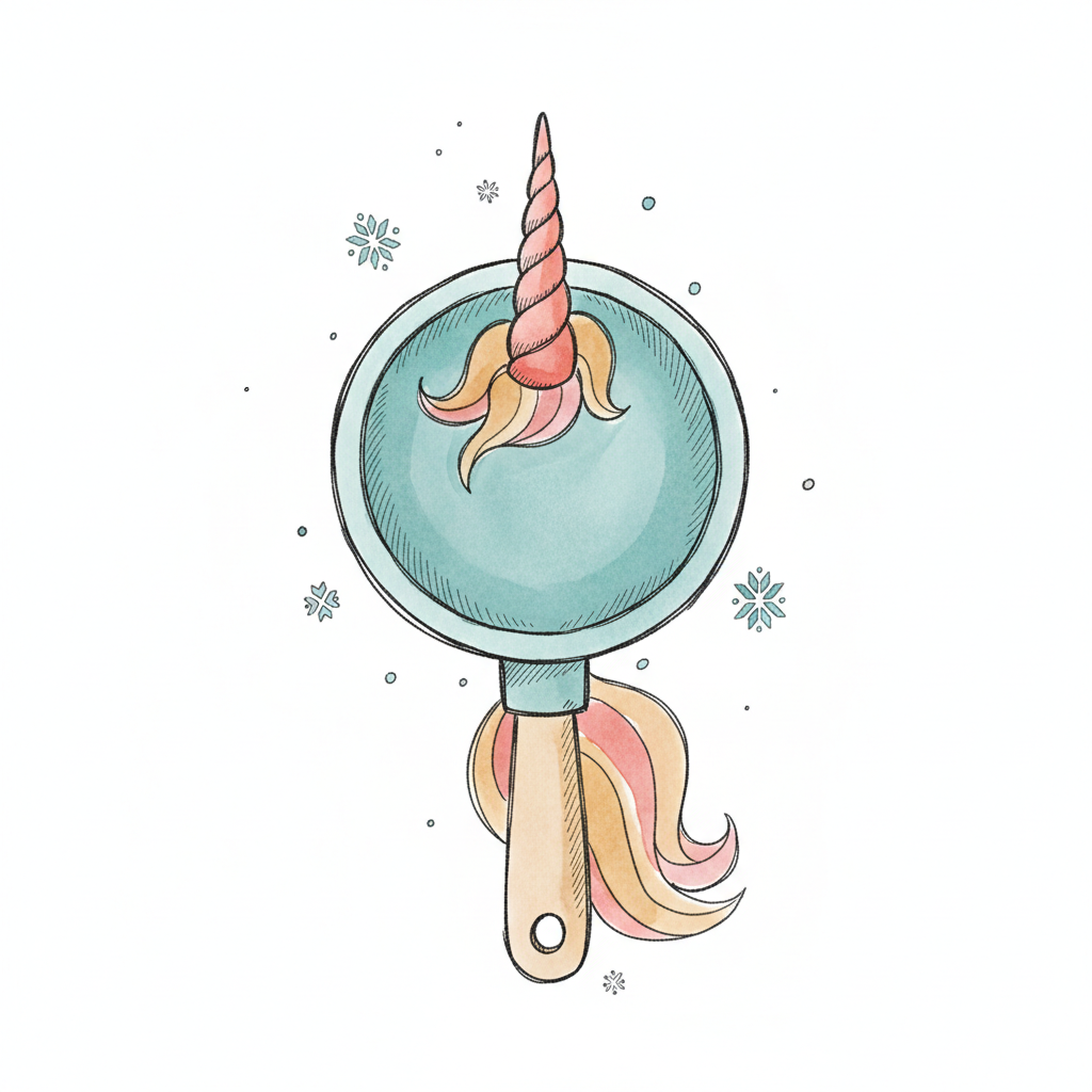Aquarell einer Pfanne mit Einhornhorn und bunter Mähne, umgeben von Schneeflocken.