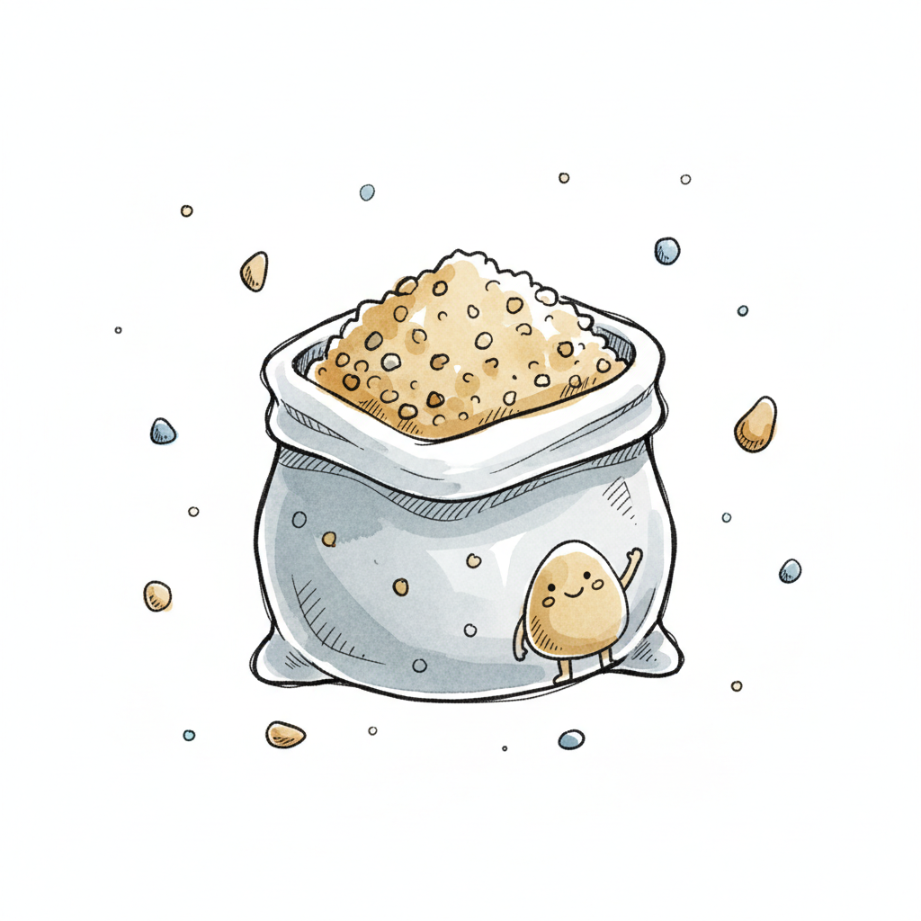 Cartoon-Sack voller Körnchen mit einem freundlichen, winkenden Körnchen-Charakter.