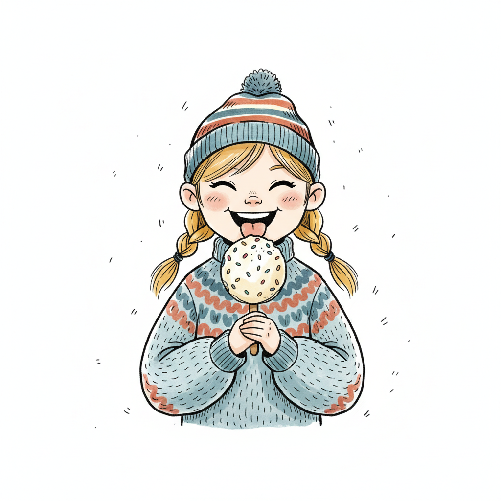 Glückliches Cartoon-Mädchen in Winterkleidung leckt genüsslich einen Lolli mit Streuseln.