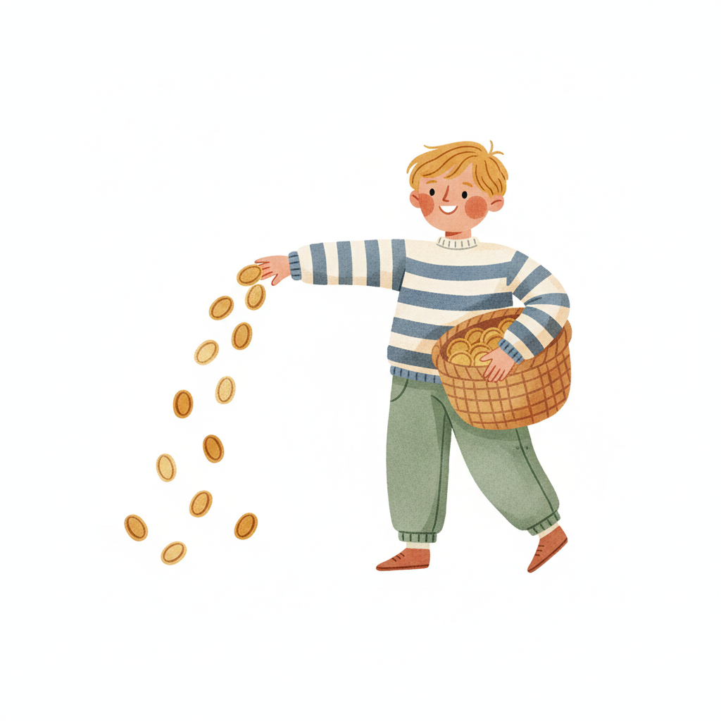 Ein lächelnder Junge streut goldene Münzen aus einem Korb.