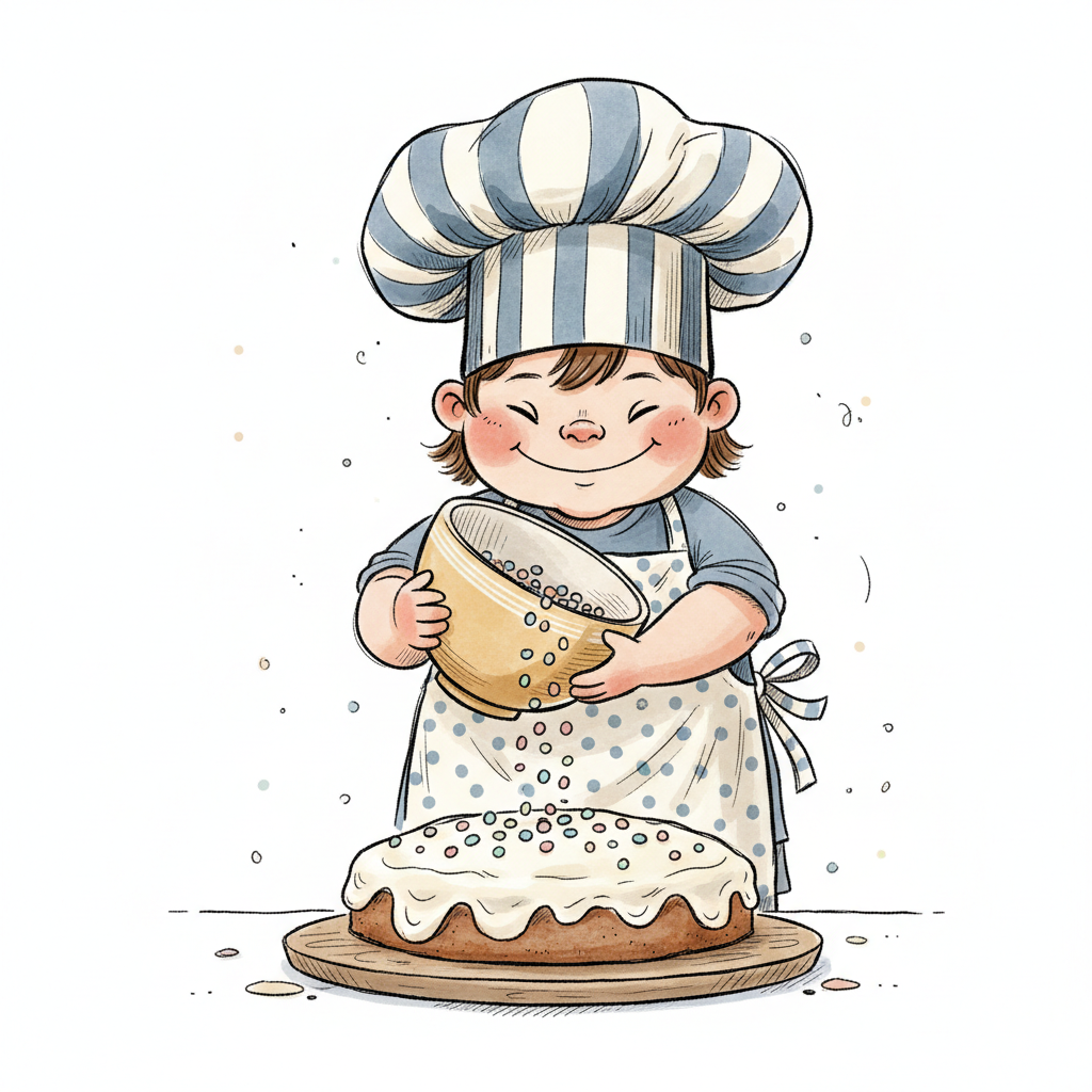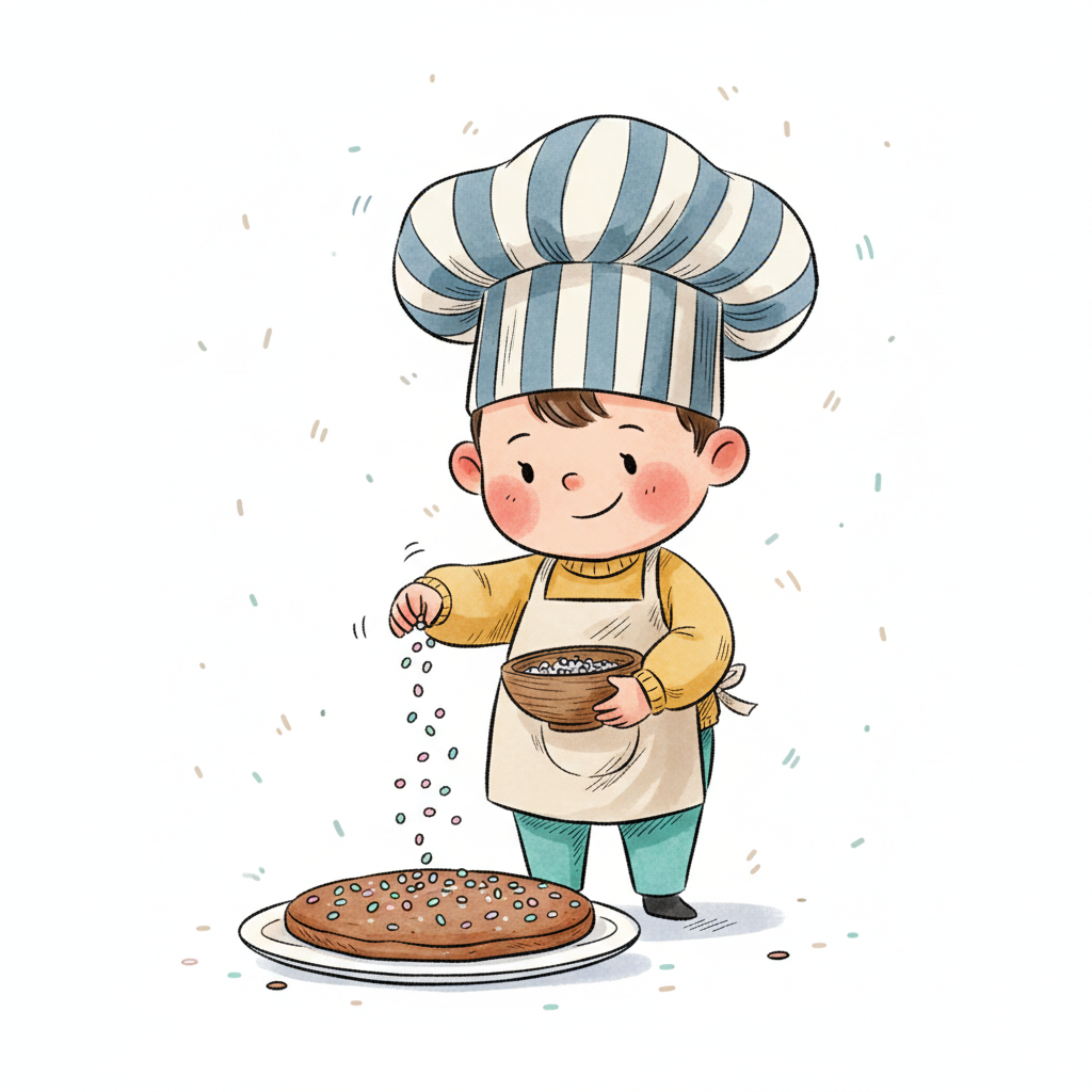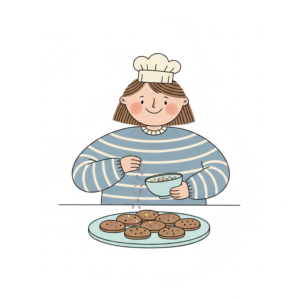 Fröhliche Cartoon-Figur mit Kochmütze bestreut Kekse auf einem Teller mit bunten Streuseln.