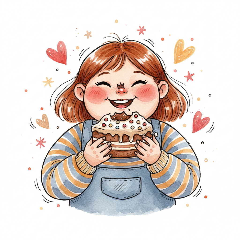 Glückliches Cartoon-Mädchen isst genüsslich ein großes Stück Kuchen mit Streuseln.