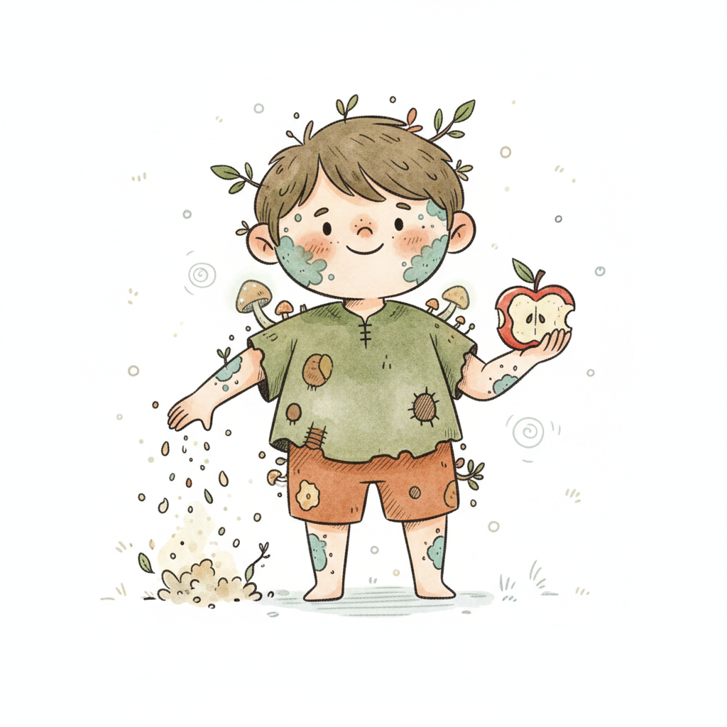 Fröhlicher Junge mit Pflanzen und Pilzen am Körper, streut Samen und hält einen Apfel.