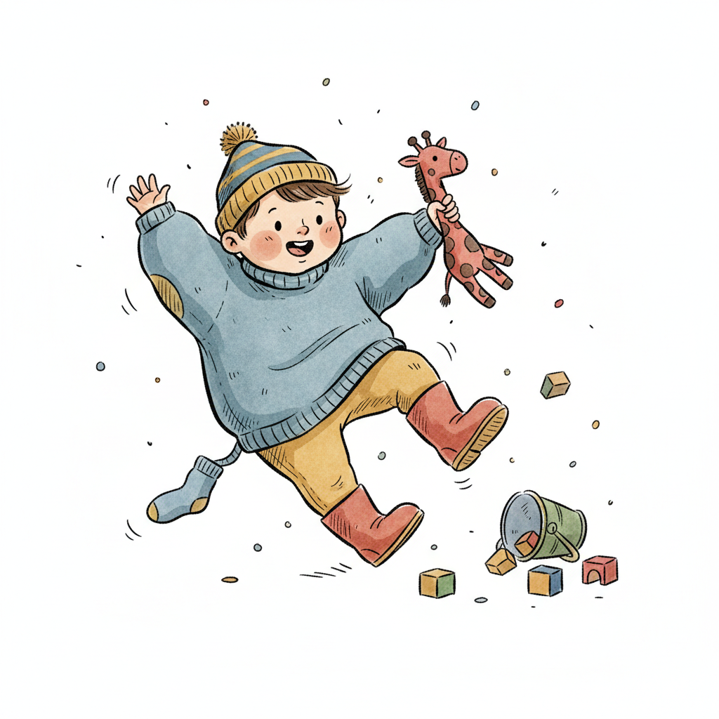 Überraschtes Kind in Latzhose und roten Stiefeln balanciert über verstreutem Spielzeug.