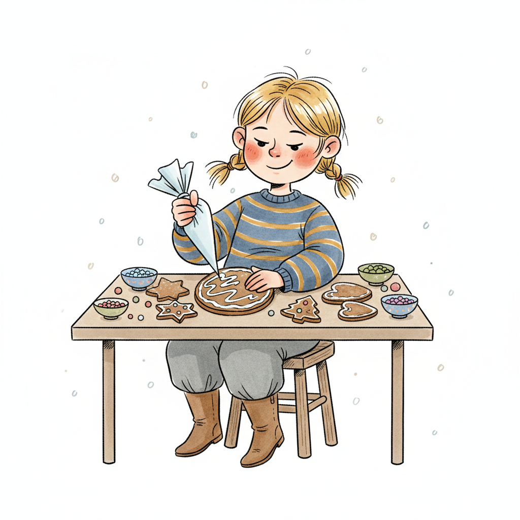 Mädchen dekoriert Lebkuchen mit Zuckerguss und Streuseln an einem Tisch, winterliche Atmosphäre.