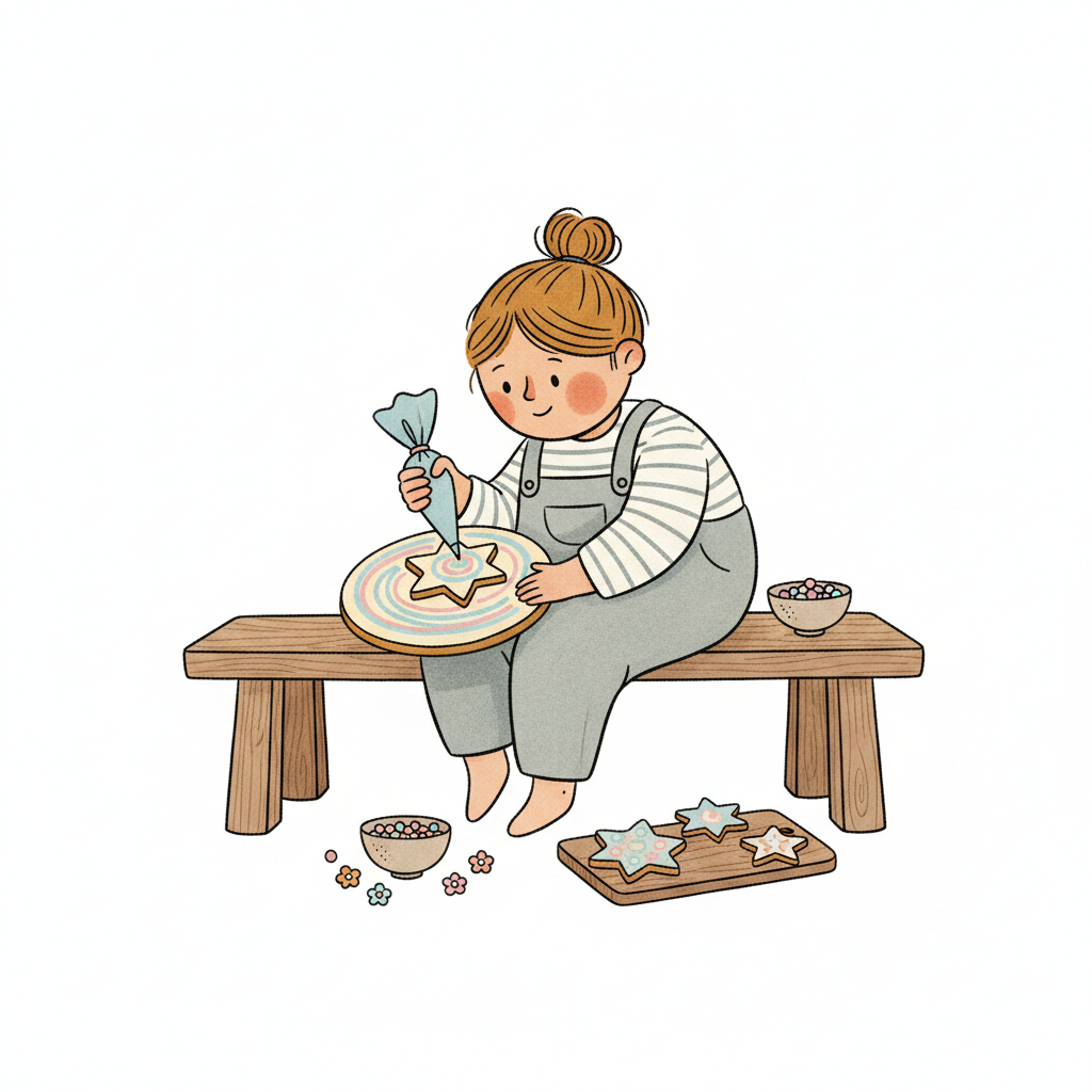 Niedliche Cartoon-Person dekoriert Sternkekse mit Zuckerguss und bunten Streuseln auf einer Bank.