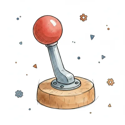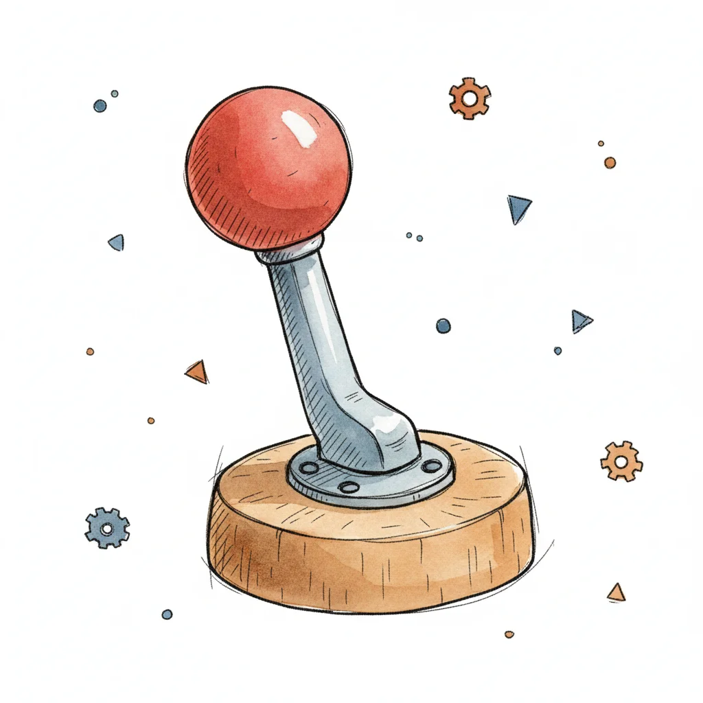 Aquarell-Illustration eines roten Joysticks auf Holzsockel mit verstreuten Zahnrädern und Formen.