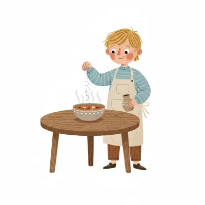 Ein lächelnder Junge in Schürze streut Gewürze in eine dampfende Schüssel auf einem Holztisch.