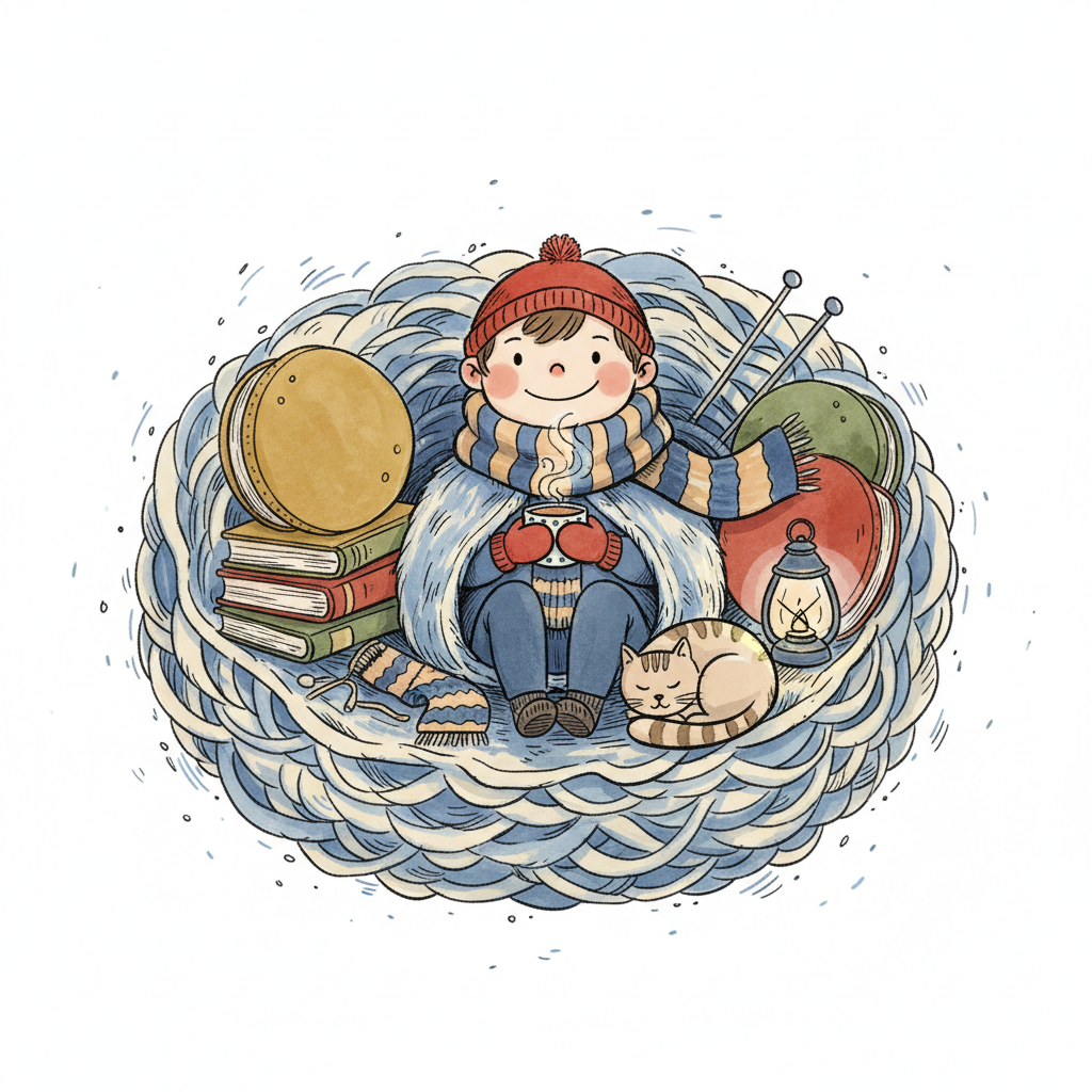 Niedliches Kind in einem gemütlichen Wollnest mit Büchern, Katze und heißem Getränk.