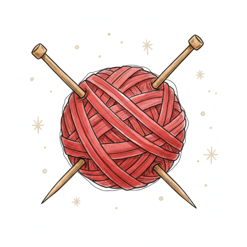 Eine rote Garnkugel mit zwei gekreuzten Stricknadeln, umgeben von kleinen Sternen.