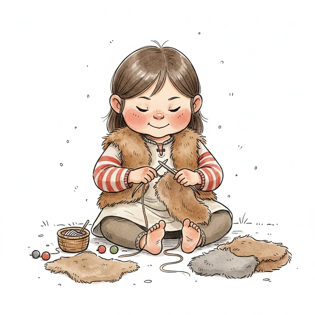 Niedliches Cartoon-Mädchen strickt gemütlich auf dem Boden, umgeben von Wolle und Pelzstücken.