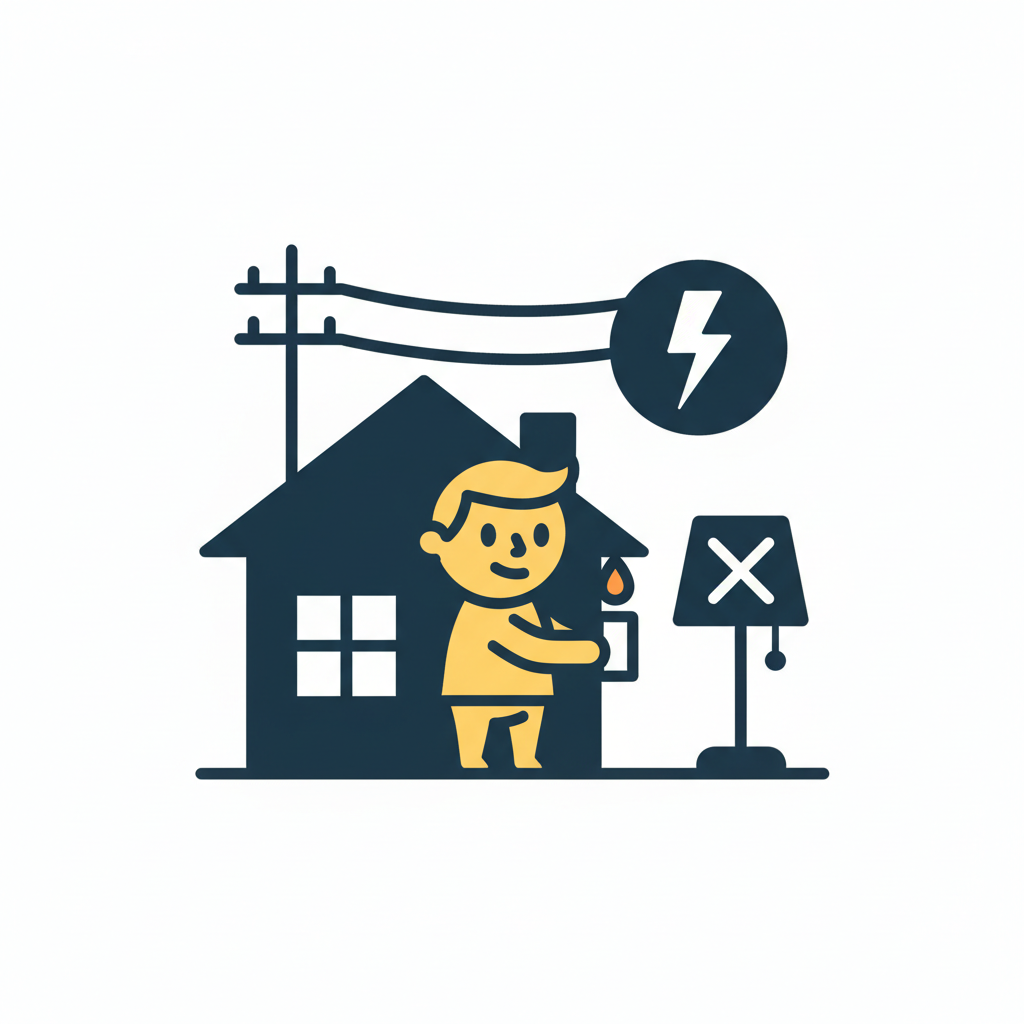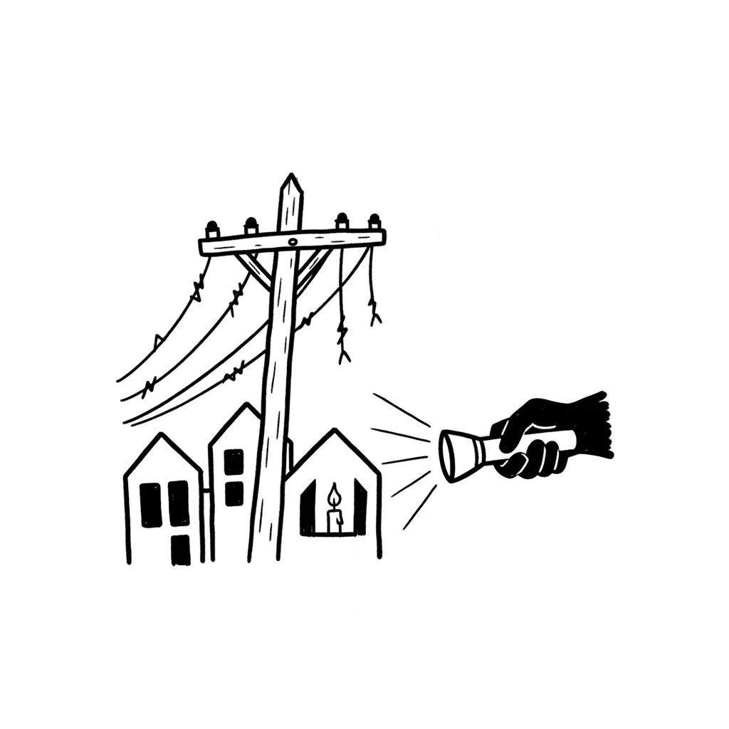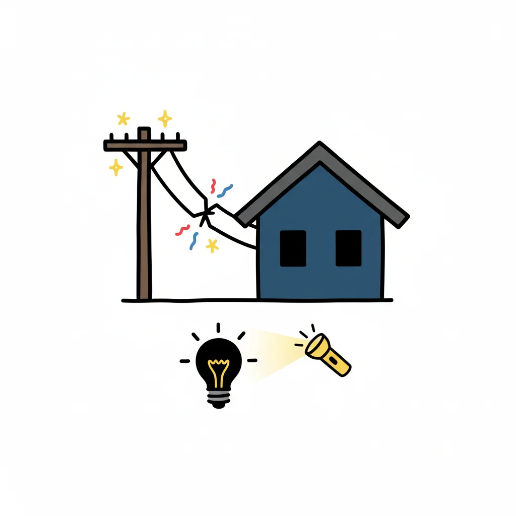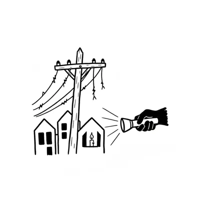 Illustration eines Stromausfalls an einem Haus mit dunkler Glühbirne und leuchtender Taschenlampe.
