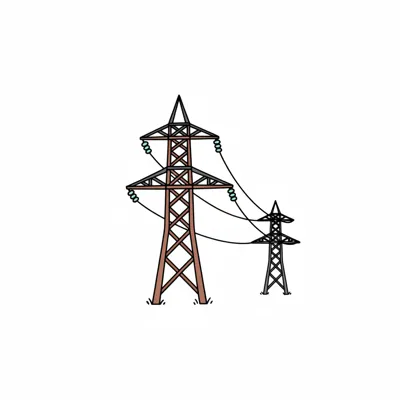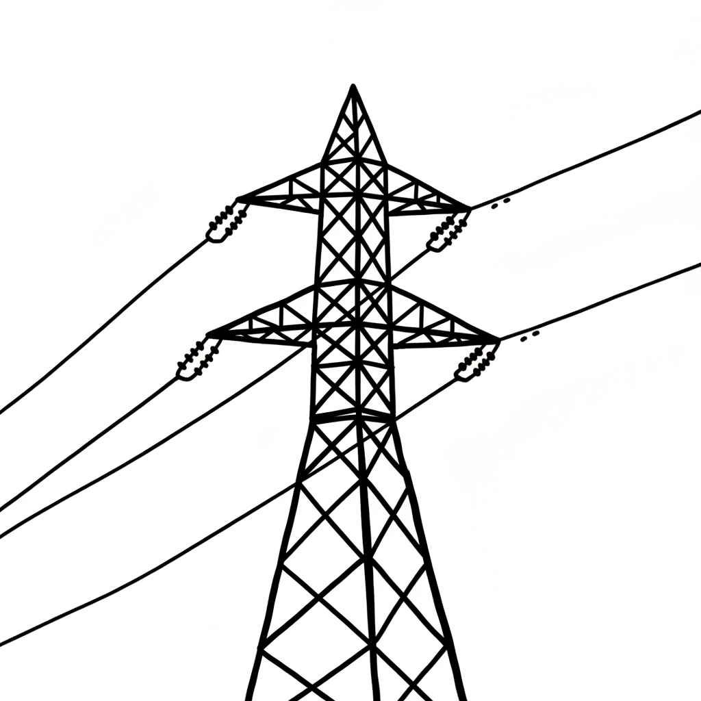 Stilisierte Schwarz-Weiß-Zeichnung eines Strommastes mit Hochspannungsleitungen.