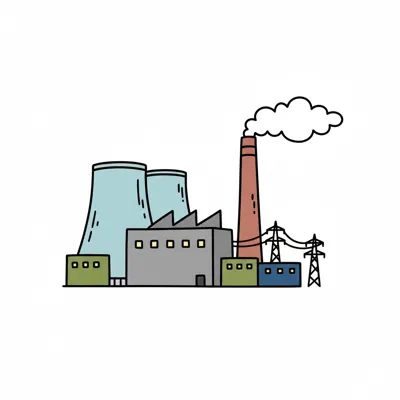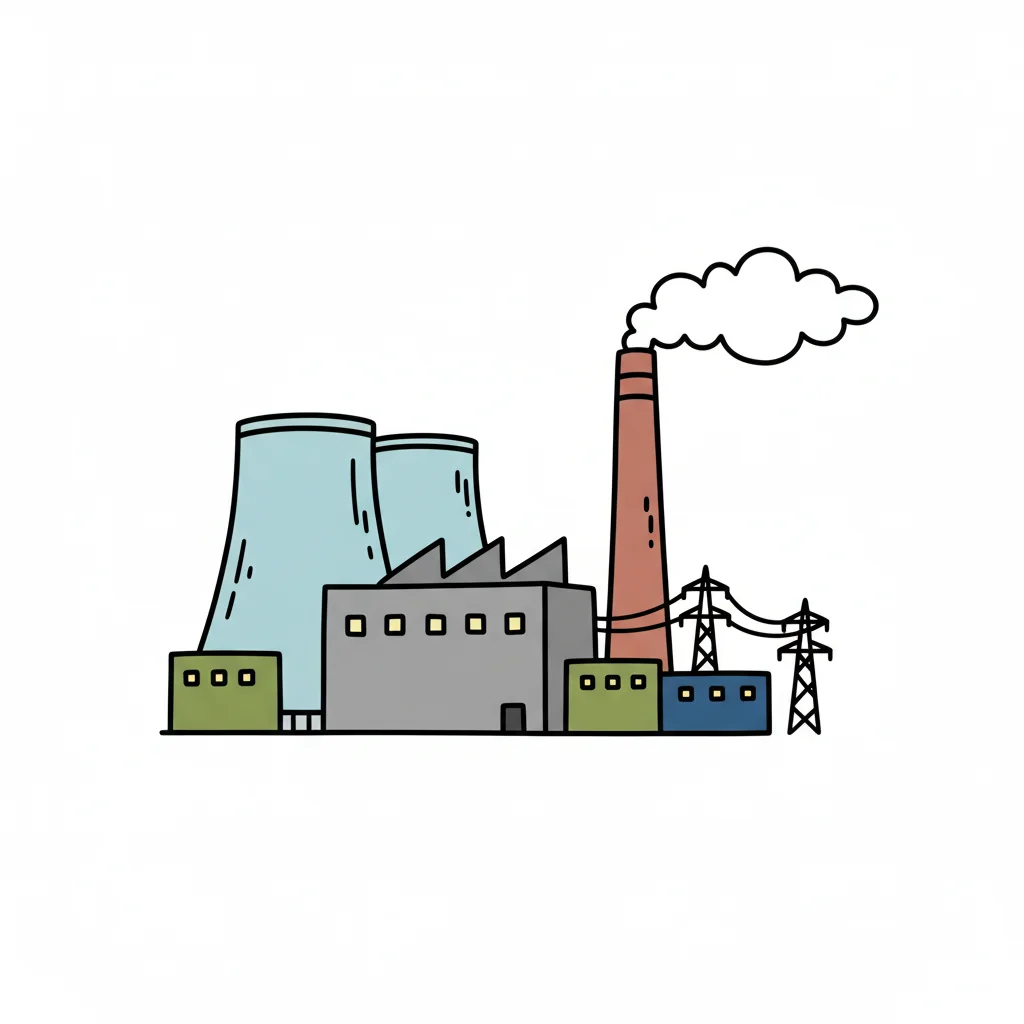 Bunte Doodle-Illustration einer Industrieanlage mit rauchendem Schornstein, Kühltürmen und Strommasten.