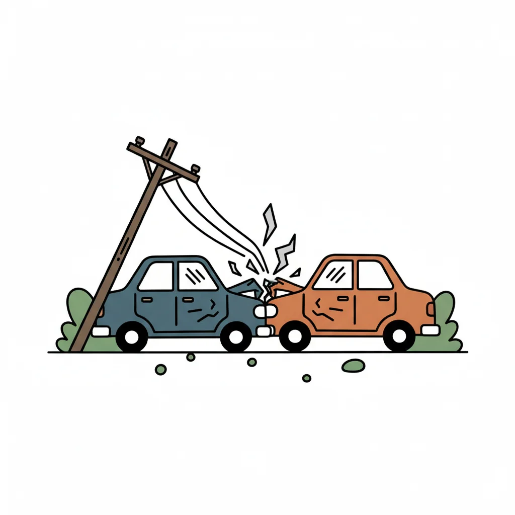 Cartoon-Illustration eines Autounfalls: Zwei Autos sind kollidiert, ein Strommast ist umgefallen.
