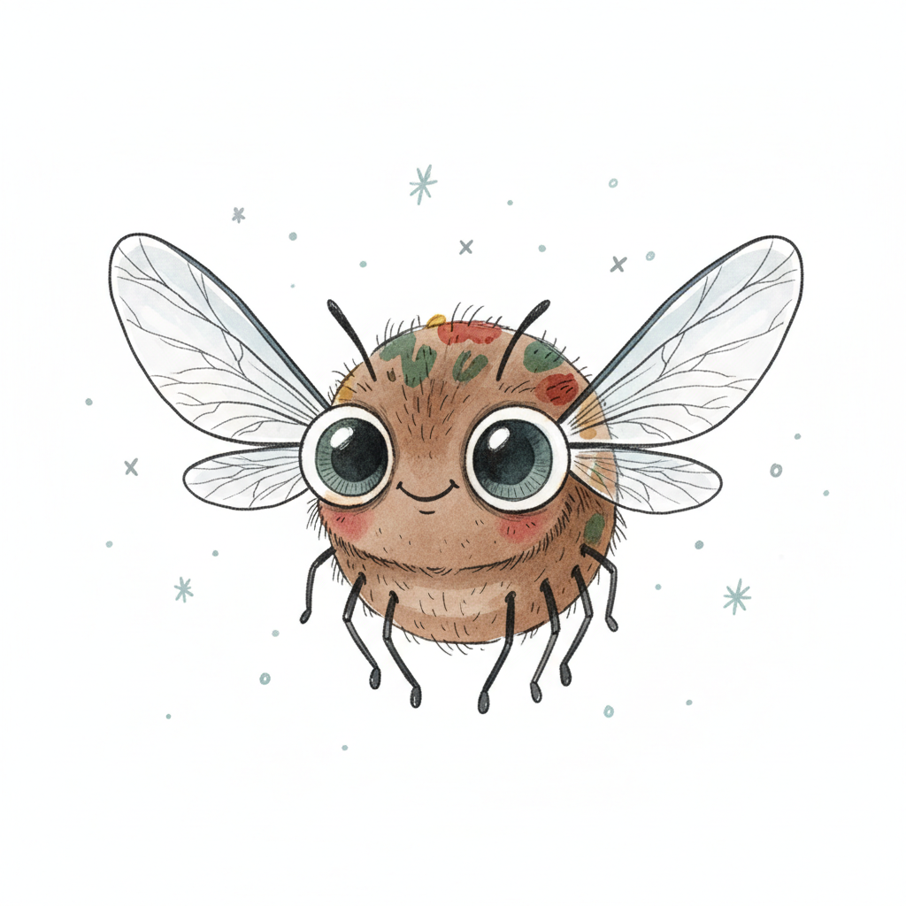 Eine illustrierte Fliege mit großen Augen und durchsichtigen Flügeln.