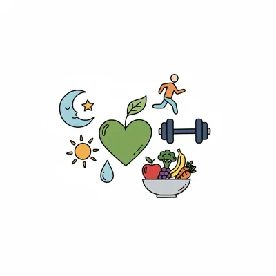Symbolik für Gesundheit: Sport, Ernährung, Natur, Wellness.