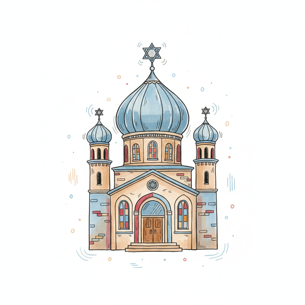 Bunte Zeichnung einer Synagoge mit Kuppeln und Davidstern.
