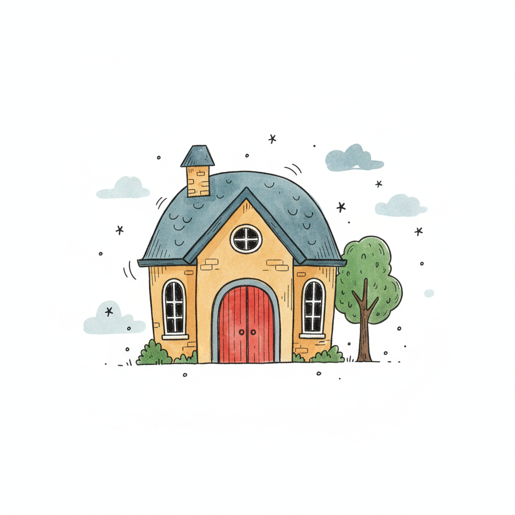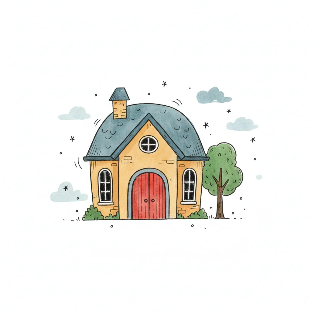 Niedliches, handgezeichnetes Haus mit blauem Dach, roten Türen und Baum, umgeben von Wolken und Sternen.