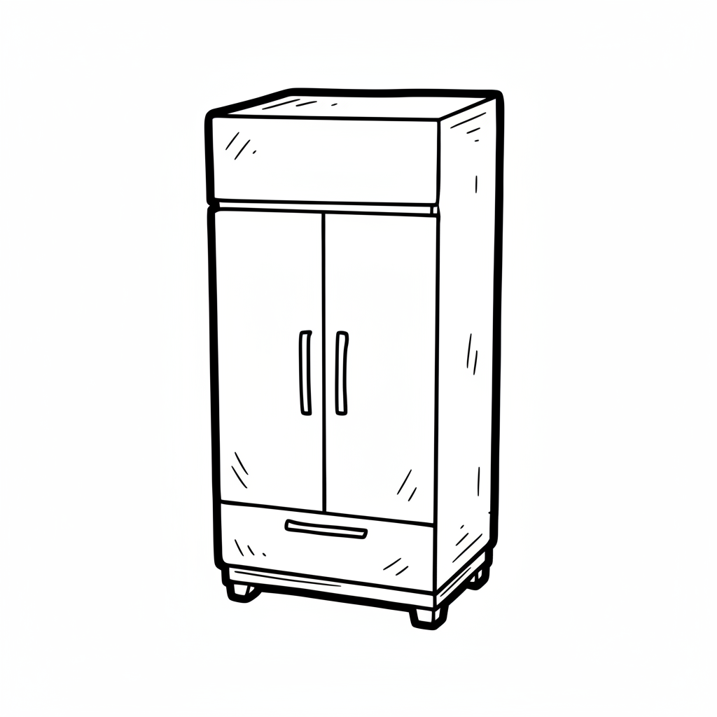 Schwarz-weiße Strichzeichnung eines Schranks mit zwei Türen und einer Schublade im Cartoon-Stil.