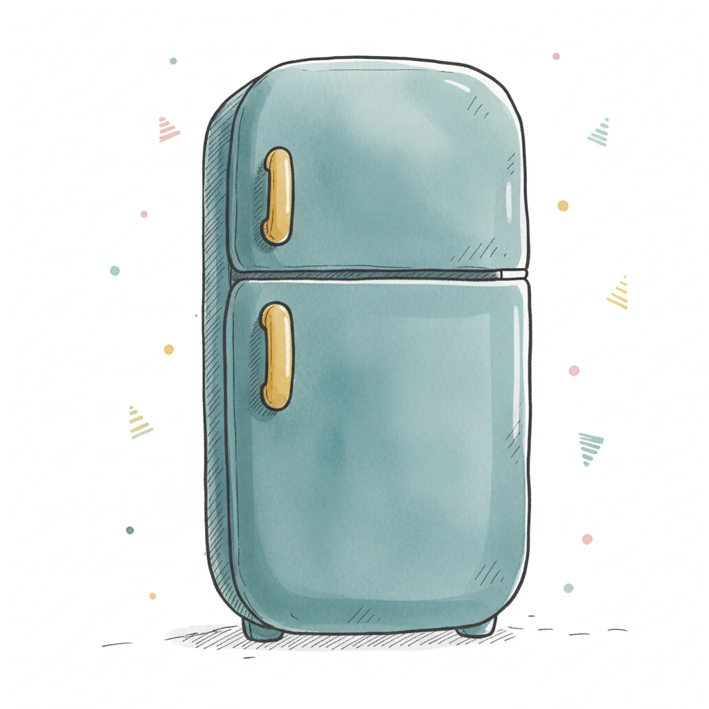 Niedliche, handgezeichnete Illustration eines hellblauen Kühlschranks mit zwei Türen und gelben Griffen.
